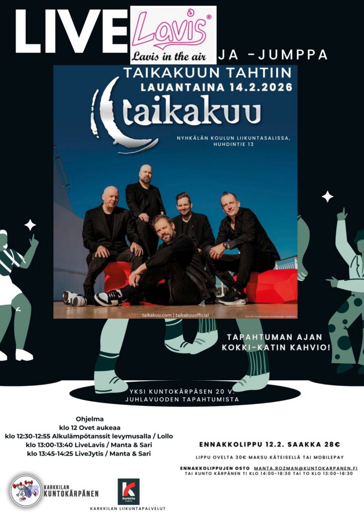 Live Lavis in the air – ja jumppa Taikakuun tahtiin lauantaina 14.2.2026 klo 12.30 – 14.25, Nyhkälän koulun liikuntasalissa, Huhdintie 13.